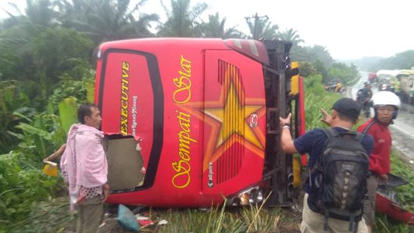 “Saat hendak belok ke kanan, tiba-tiba ada motor dari arah berlawanan. Bus tergelincir karena jalanan licin dan langsung terbalik,” kata Frido, Kamis (1/6) siang.