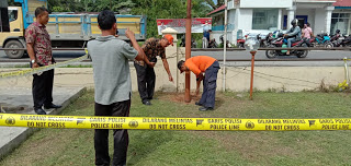Petugas dari Dinas Lingkungan Hidup dan polisi memberi police line di lokasi tanah yang mengeluarkan asap. |