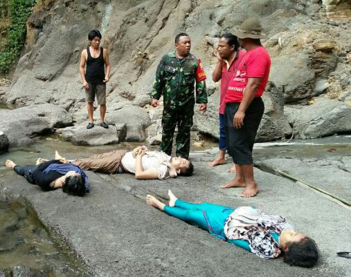 Saat rombongan sedang mandi tiba-tiba tanah tebing di seputaran air terjun longsor dan menimpa rombongan yang ada di tepi sungai.