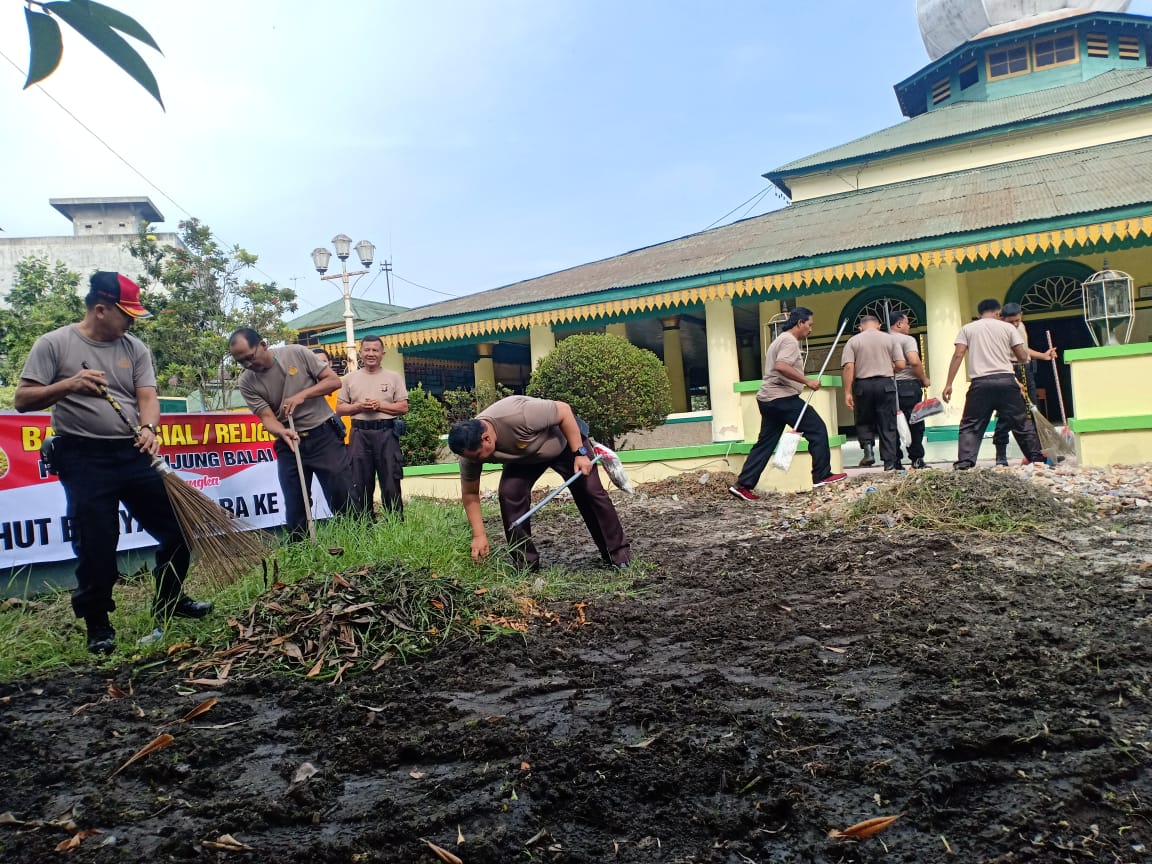 TASLABNEWS, TANJUNGBALAI – Dalam rangka memperingati Hari Ulang Tahun (HUT) Bhayangkara yang ke-73, seluruh personil Polres Tanjungbalai serta jajarannya meggelar kerja bhakti di halaman Mapolres Tanjungbalai dan ke sejumlah rumah ibadah yang ada di kota itu, Selasa (18/6/2019).