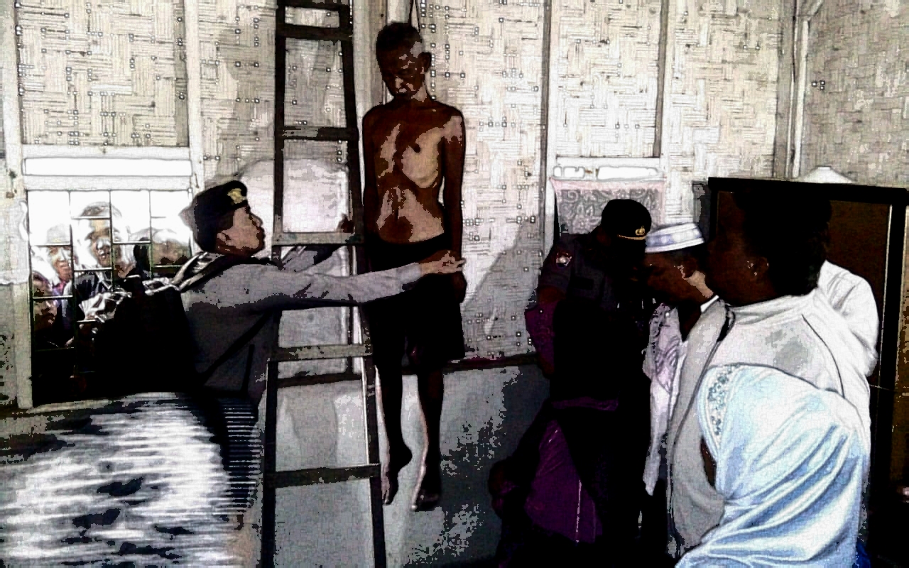 Kemudian Heri memanjat jendela rumah korban, dan melihat tubuh Ayah mereka tergantung dengan kabel listrik yang terikat di tiang penyangga atap rumah korban.