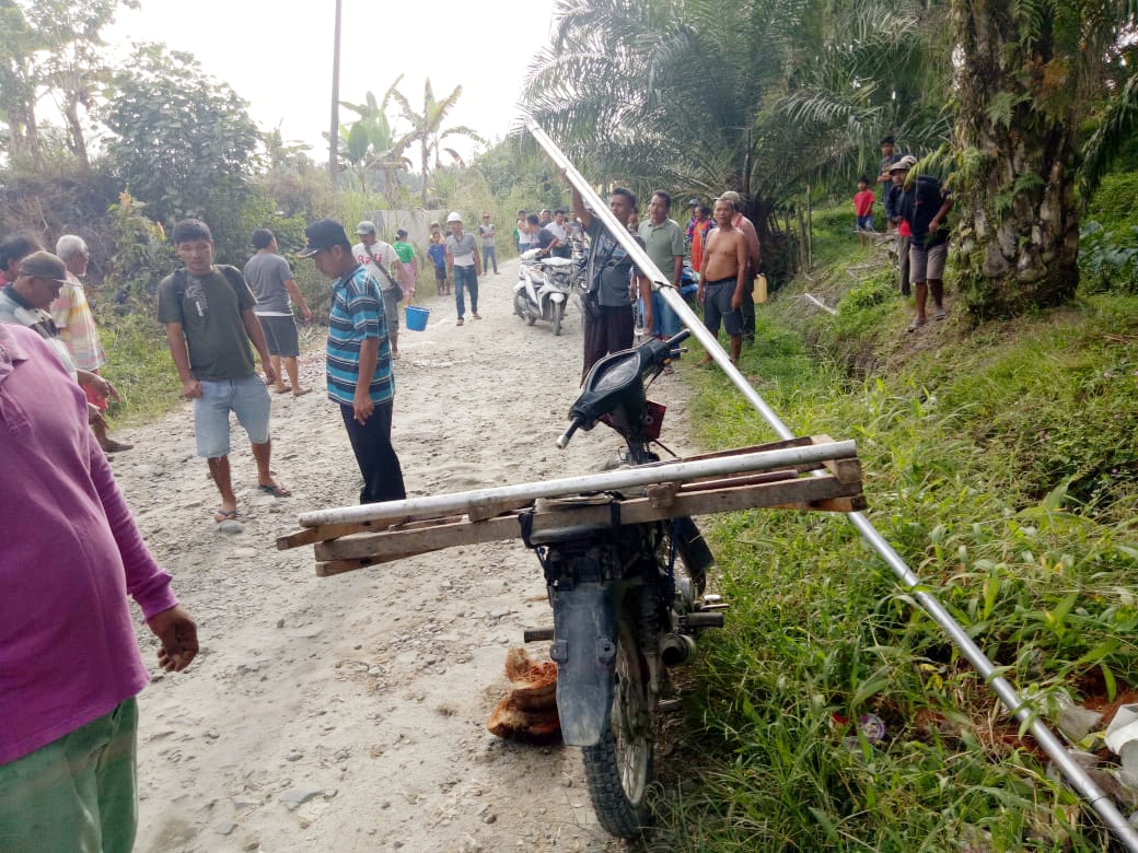 Menurut Iptu Jaresman Sitinjak, korban mengendarai sepeda motor Honda Supra Fit membawa alat egrek dengan gagang sepanjang 6 meter untuk memanen sawit di ladangnya.