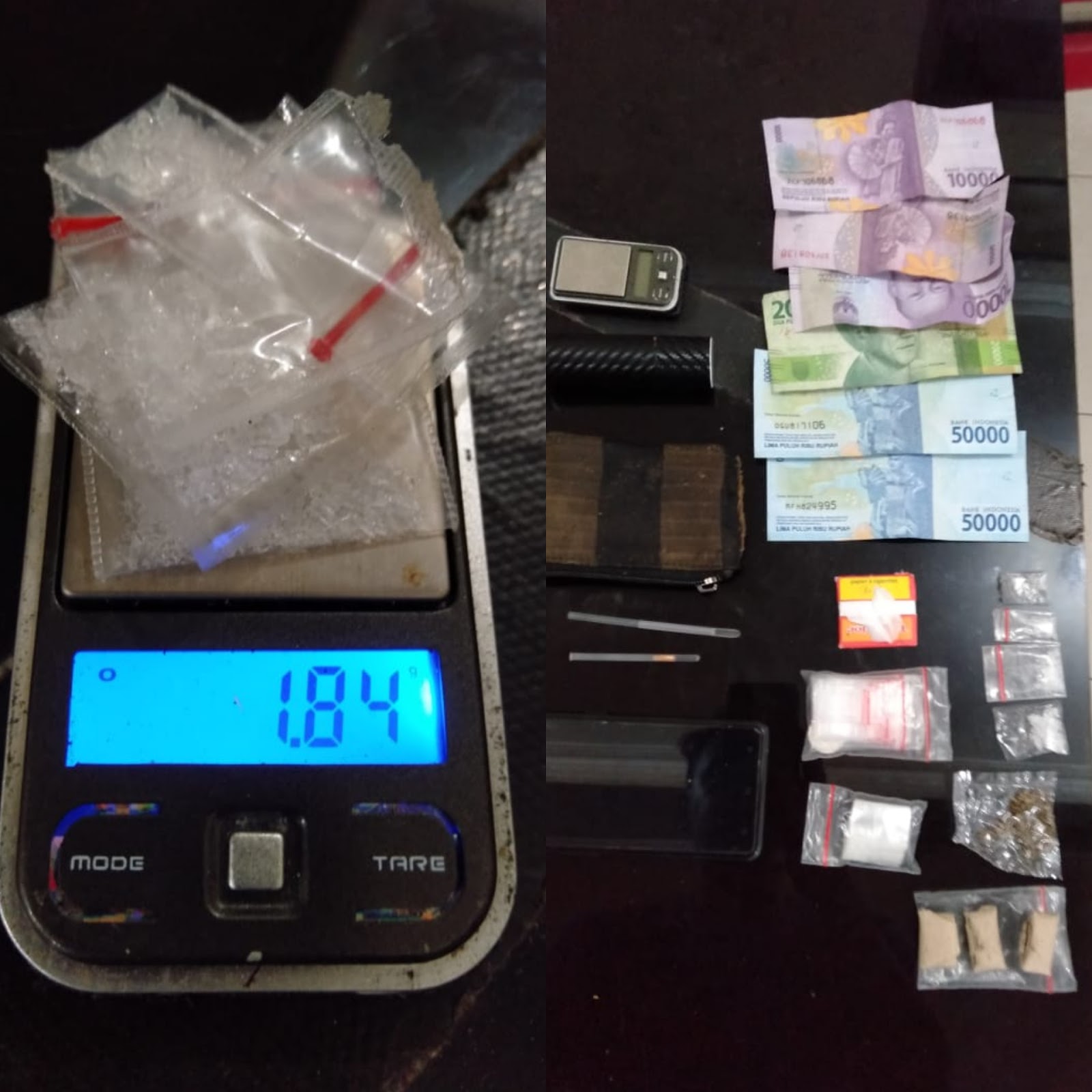 Kemudian, 1 buah dompet emas warna hitam berisikan 1 bungkus kertas tiktak, 1 unit timbangan elektrik, bungkus plastik klip kosong, 2 buah Pipet, 1 unit HP Merk Oppo dan Uang tunai sejumlahRp 150.000.