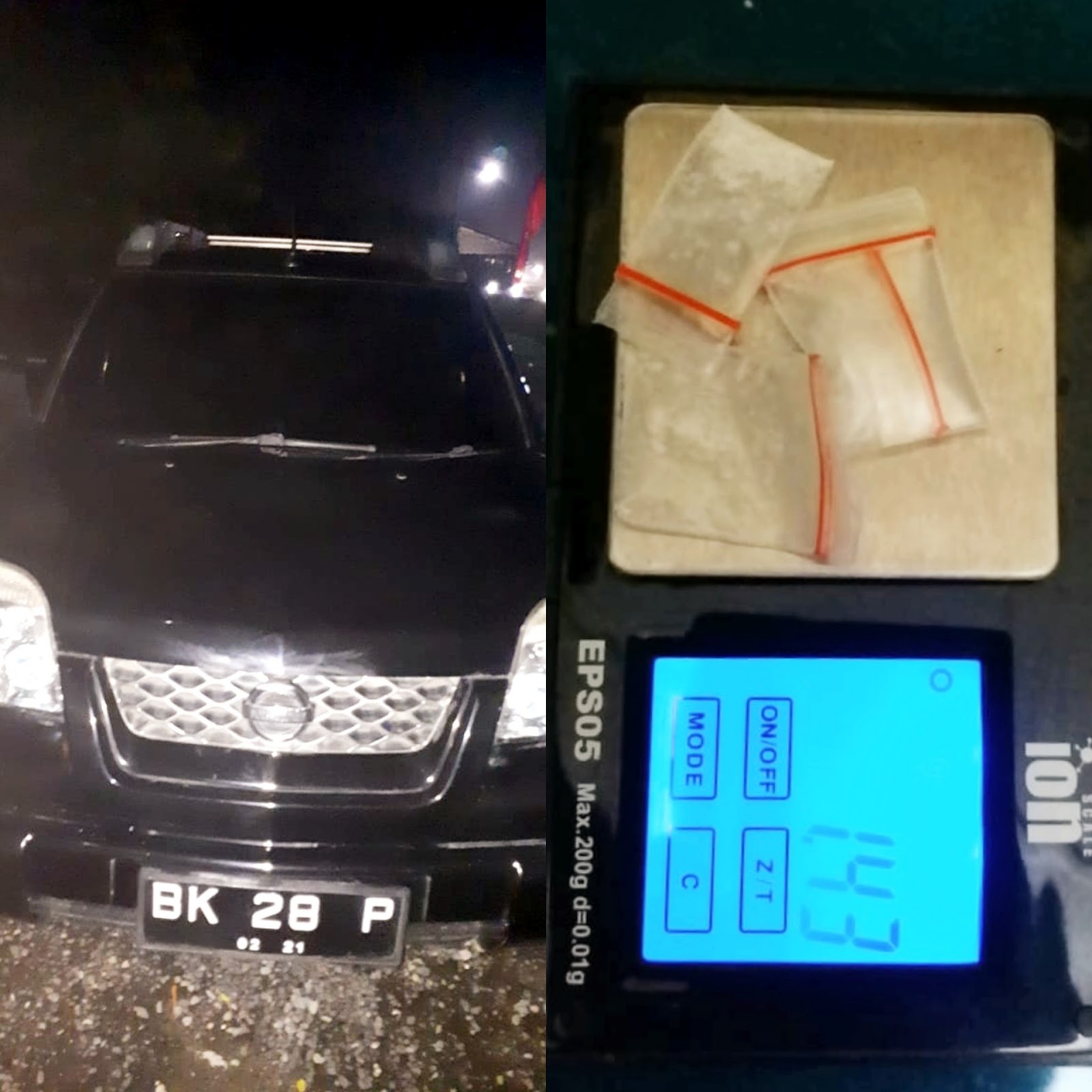 Petugas menemukan 3 klip plastik bening berisi diduga sabu, 10 klip plastik bening kosong, 1 unit alat hisap (Bong), 1 mancis, 2 kaca pireks, 1 sekop sabu dan 1 unit HP merek SAMSUNG warna putih dari dalam laci dashboard mobil.