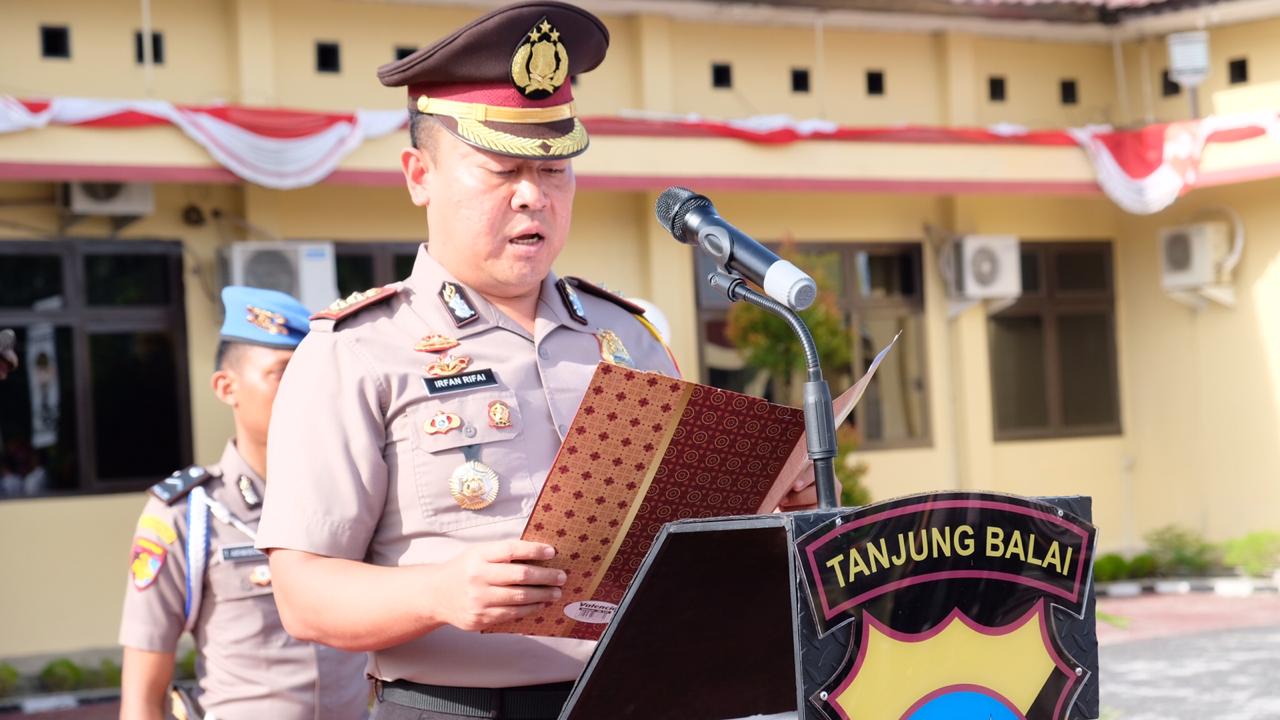 | Upacara serah terima jabatan 6 perwira di Lapangan Apel Kapolres Kota Tanjungbalai. |