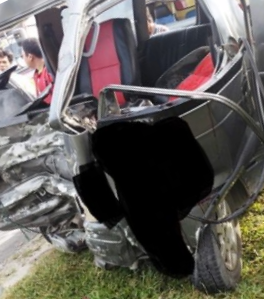 | Minibus yang ringsek akibat kecelakaan di Tobasa. |