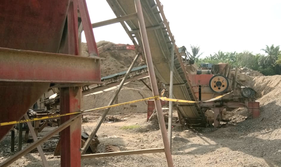 | Mesin Stone Crusher milik CV Indo Karya Alam yang dipasangi garis polisi. |