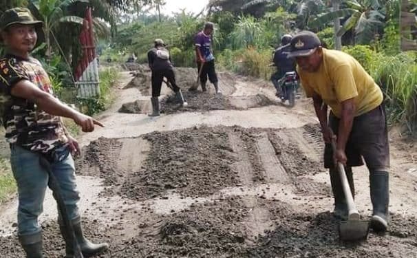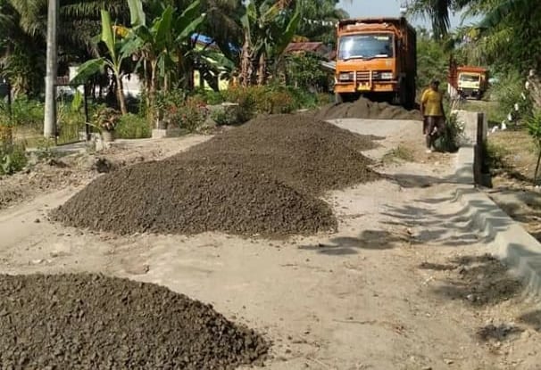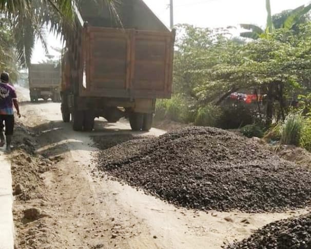 Pantauan awak media di lapangan, sejumlah material diturunkan dari beberapa truk pengangkut untuk melapis jalan tanah tersebut.