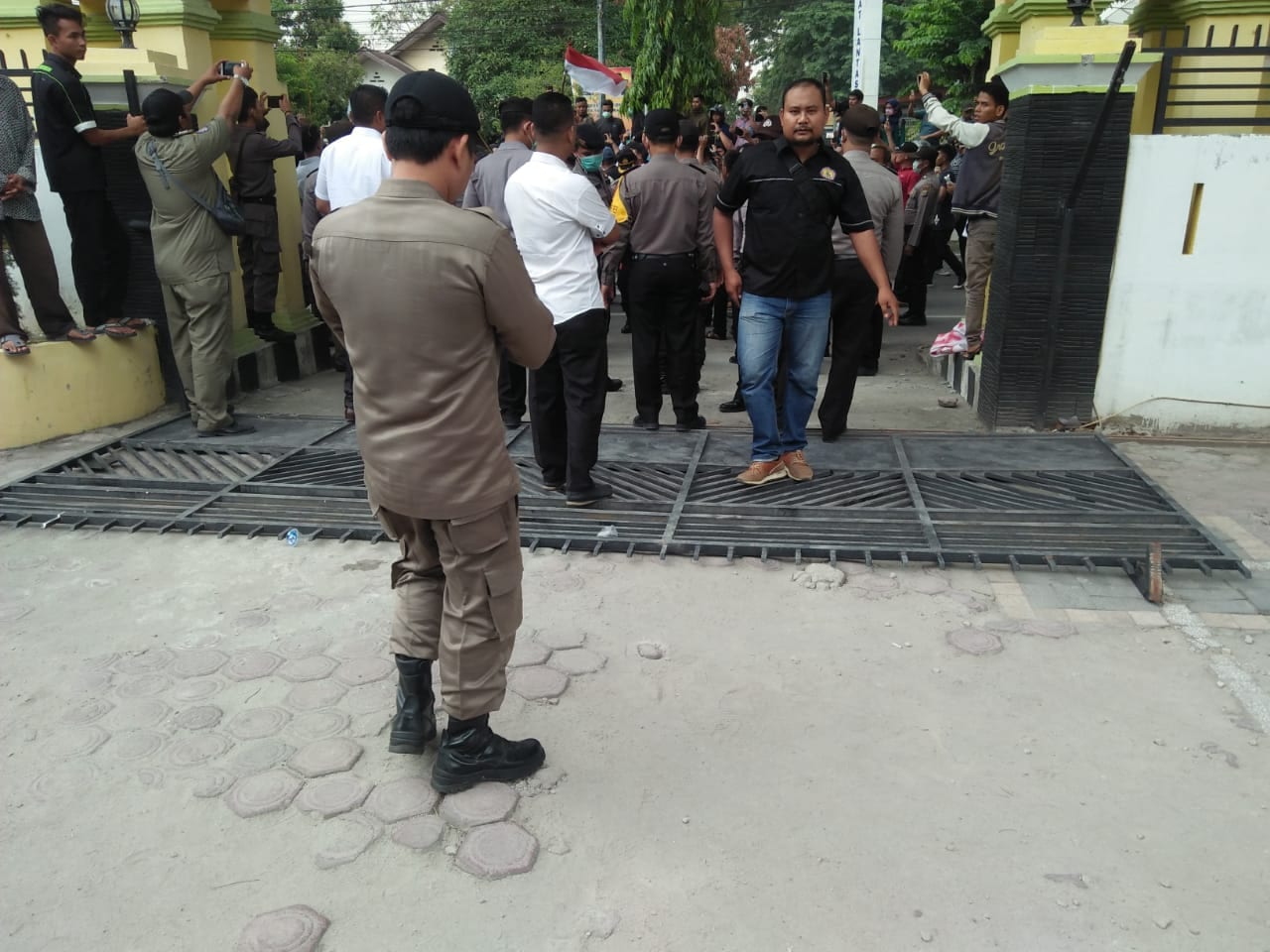 Aksi demontrasi sempat ricuh di gedung Dewan Perwakilan Rakyat (DPRD). Pintu gerbang ambruk dan kaca pintu masuk gedung pecah.
