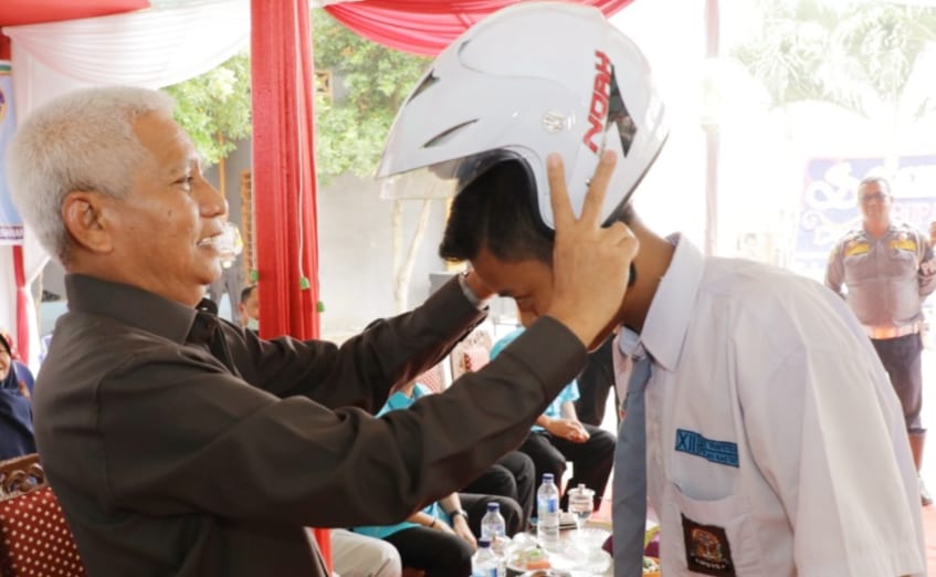 Pada kesempatan ini juga Plt Bupati Asahan memberikan helm kepada para siswa-siswi Yaspenda Pulau Rakyat.