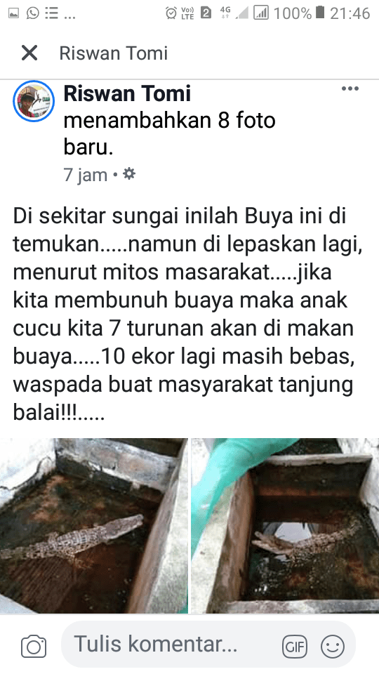 “Tiga ekor lari ke sungai dan satu ekor naik ke darat, yang lari ke darat berhasil ditangkap,” kata Riswan Tomi dalam status facebooknya.