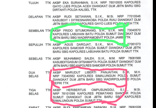 Kelimanya yakni, Kapolres Samosir, Kapolres Simalungun, Kapolres Pematang Siantar, Kapolres Labuhan Batu dan Kapolres Tanjungbalai.