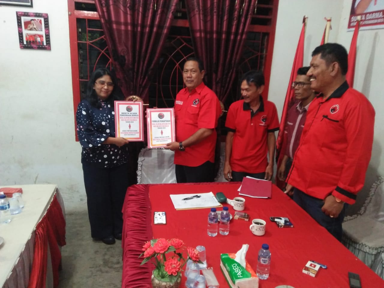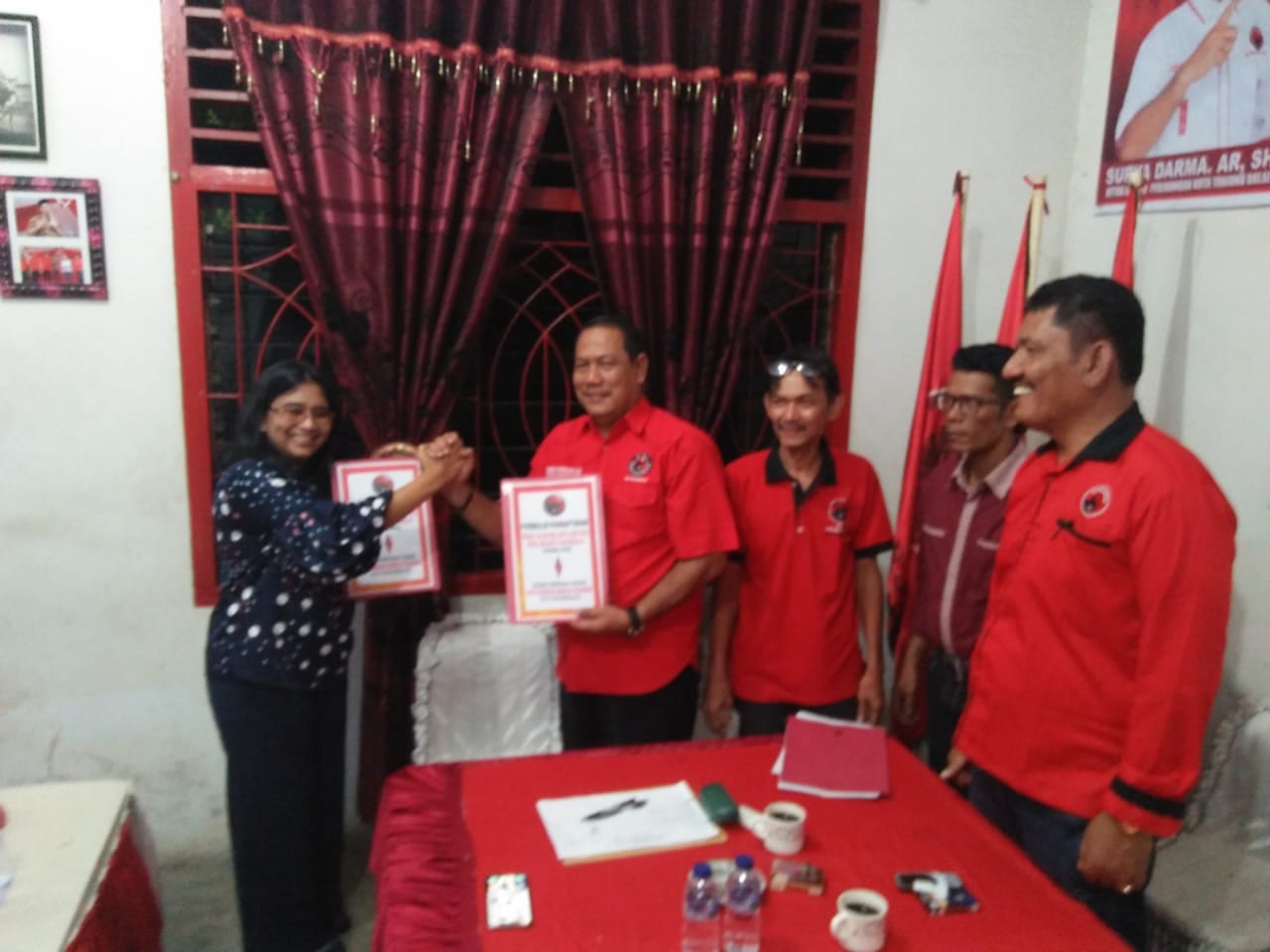 Ketua DPC PDI Perjuangan Kota Tanjungbalai Surya Dharma AR dan Siti Fatimah saat melakukan serah terima berita acara pendafataran di Sekretariat DPC PDI Perjuangan, Kota Tanjungbalai.