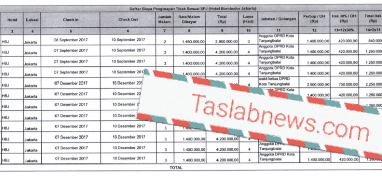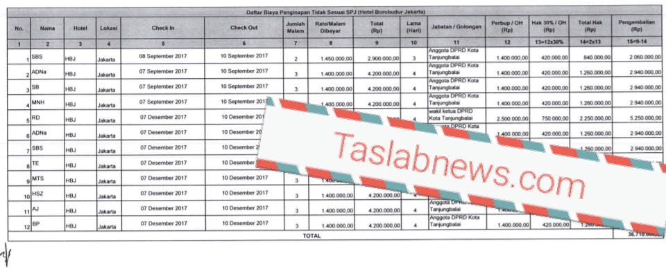 TASLABNEWS, TANJUNGBALAI-Ternyata di Hotel Borubudur Jakarta Wakil Ketua DPRD Tanjungbalai hanya berhak menerima Rp2,250.000 untuk biaya penginapan. Namun fakta di lapangan Wakil Ketua DPRD menerima Rp7,5 juta.