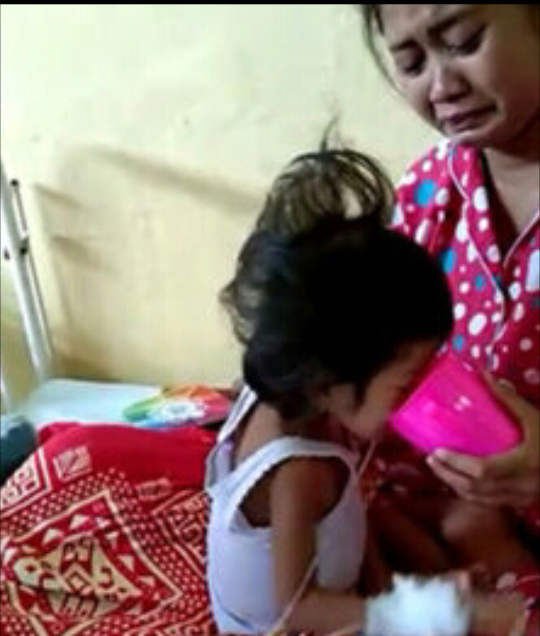 “Seperti inilah kondisi putri ku ini bang. Perutnya besar dan keras, dia tidak mau makan. Kalau dikasi makan dia muntah. Dia cuma mau minum air saja,” katanya.