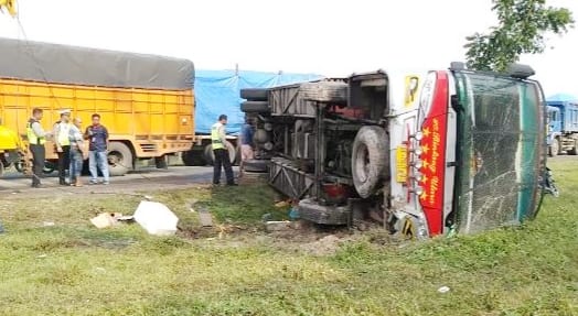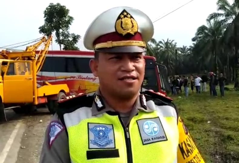 “Pengemudi bus terkejut melihat truk trailler berhenti, langsung mengerem mendadak dan banting kemudi, namun akibatnya bus oleng dan terjungkal ke areal kebun sawit,” tuturnya.
