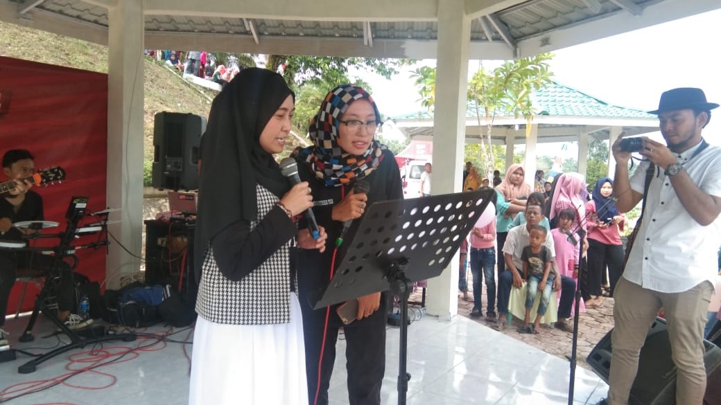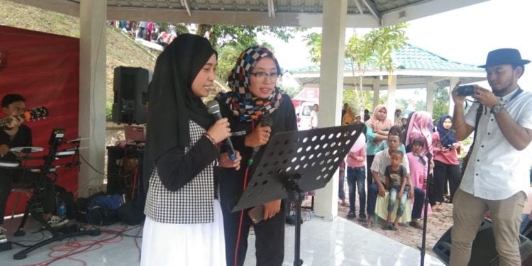 Saat bernyanyi, Winda Fitrika didampingi Tokoh Perempuan Kabupaten Asahan, Dian Marwah SH, juga diiringi musik yang dimainkan grup Protista Band asal Kisaran.
