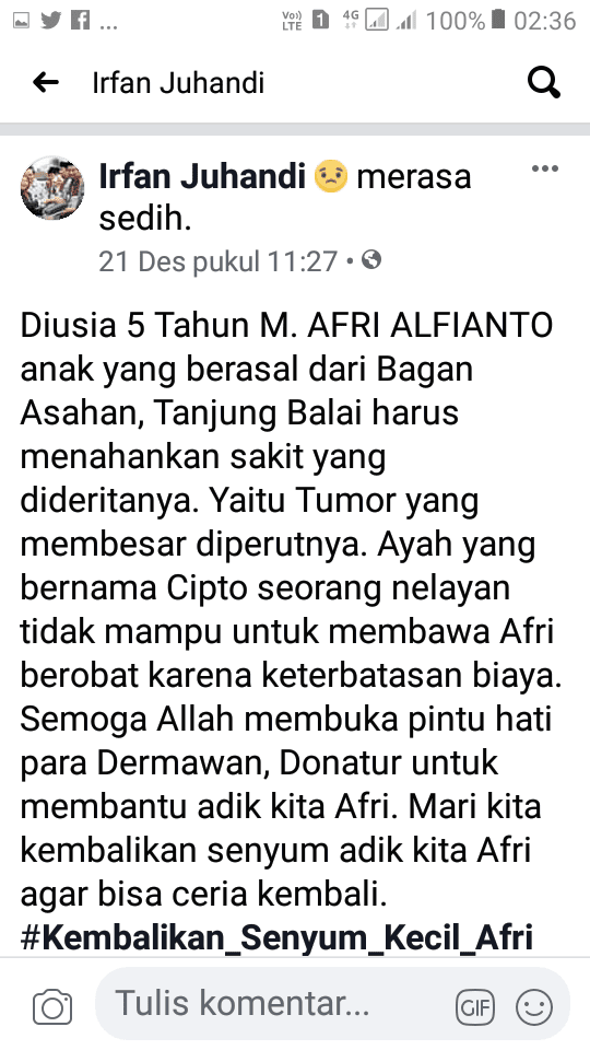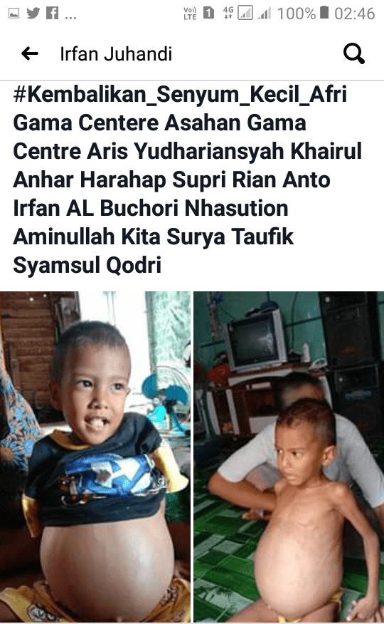Pantauan taslabnews, dalam postingannyatanggal 21 Desember 2019 Irfan menyebutkan diusia 5 Tahun M. AFRI ALFIANTO anak yang berasal dari Bagan Asahan, Tanjungbalai harus menahankan sakit yang dideritanya. Yaitu Tumor yang membesar diperutnya.