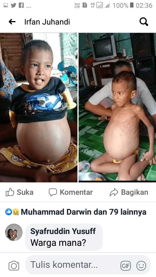 TASLABNEWS, ASAHAN-Postingan Irfan Juhandi di akun faceboknya tentang M Alwi Afrianto (5) warga Bagan Asahan, Tanjungbalai yang menderita tumor perut mendapat respon dari 79 facebooker.