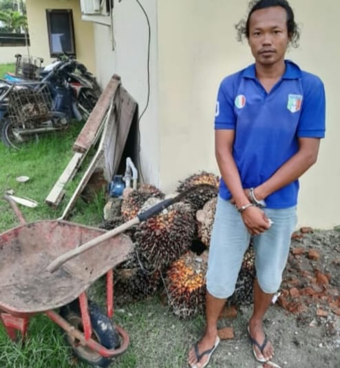 TASLABNEWS, ASAHAN – Kehilangan 10 tandan buah sawit dari kebun miliknya, Suarto (47) melapor ke Polsek Simpang Empat, Polres Asahan. Pelaku langsung diciduk petugas dari kediamannya di Dusun VI Desa Pulau Tanjung, Kecamatan Teluk Dalam, Asahan.