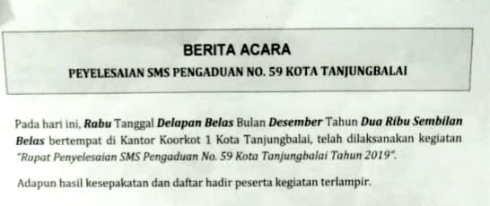 Pada kesempatan itu, Latifah Hanum juga menyerahkan bukti berita acara pelaksanaan rapat BKM se-Kota Tanjungbalai terkait dengan informasi adanya pemungutan dana tersebut tertanggal 18 Desember 2019. Dan rapat tersebut dihadiri oleh sebanyak 23 dari 24 BKM se- Kota Tanjungbalai yang menerima Program KOTAKU tahun 2019 serta diketahui oleh Rahmat Syarif selaku Koordinator Kota I Kota Tanjungbalai.