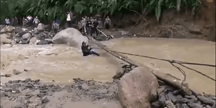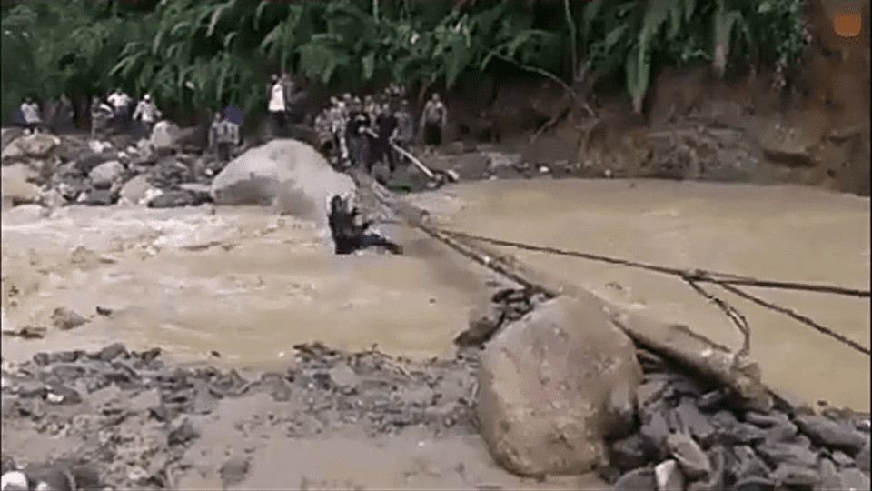 Beliau tergelincir hingga jatuh ke sungai saat menyeberangi jembatan darurat sepanjang 30 meter yang terbuat dari kayu pohon pinang.