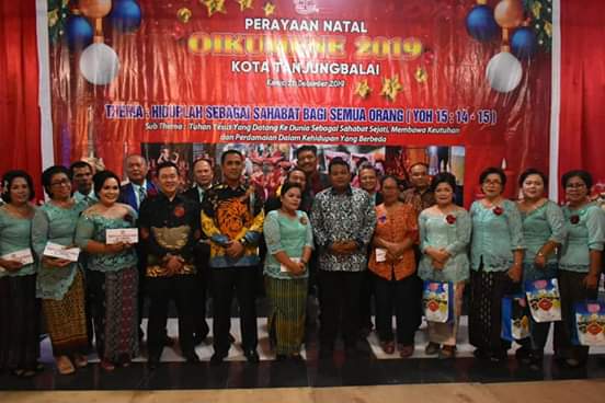 Perayaan Natal Oikumene dihadiri langsung Wali Kota Tanjungbalai H M Syahrial SH MH, Ketua DPRD Tengku Eswin ST, Kapolres Tanjungbalai AKBP Putu Yudha Prawira SIK MH.