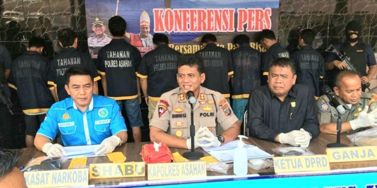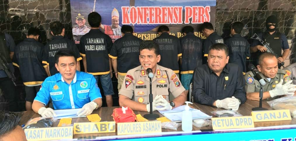 TASLABNEWS, ASAHAN – 40 tersangka tindak pidana penyalanggunaan narkoba berhasil diringkus Sat Narkoba Polres Asahan dari berbagai tempat di Kabupaten Asahan. Dari ke-40 tersangka tersebut disita barang bukti, berupa ganja seberat 2.859 gram, sabu seberat 220,31 gram dan pil ekstasi seberat 0,12 gram.