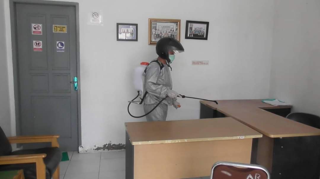 Penyemprotan itu, dilakukan petugas dengan merata di setiap ruangan yang terdapat di kantor tersebut. Dengan menggunakan alat perlindungan diri, petugas menyemprotkan cairan desinfektan, terutama terhadap benda yang sering disentuh pegawai.