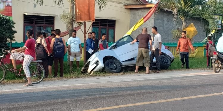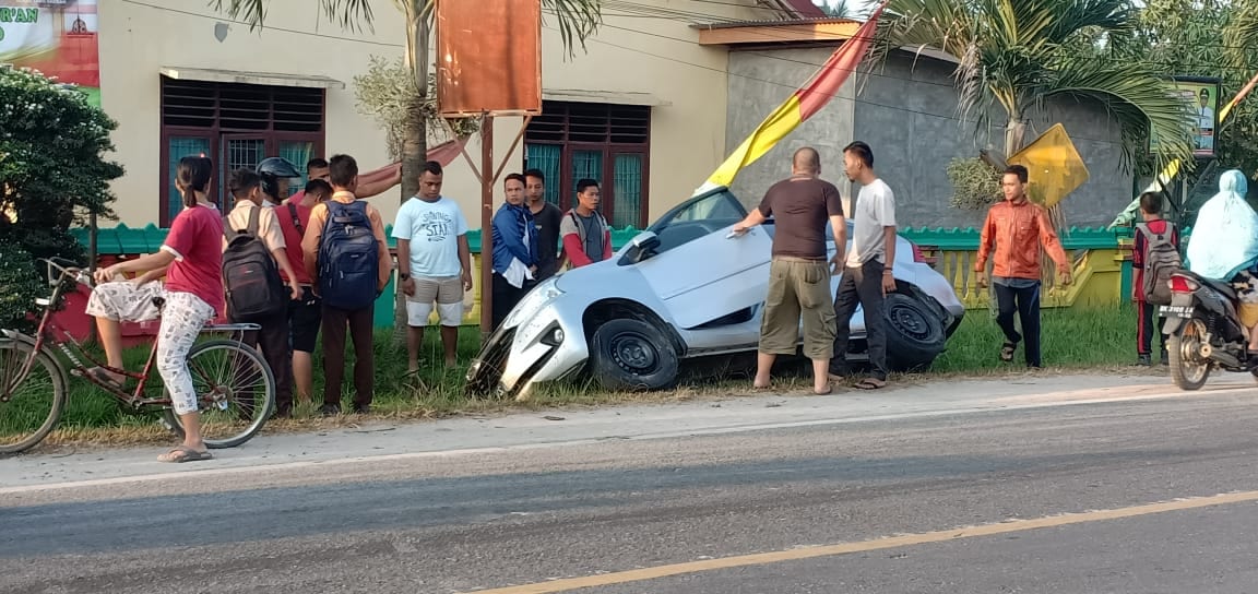 Mobil mini bus jenis Daihatsu Xenia warna silver BK 1062 VS berada di dalam parit di Simpang Empat, Sabtu (14/3).