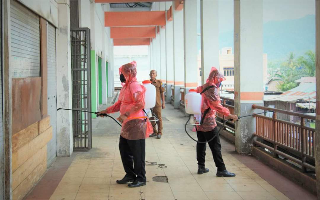 TASLABNEWS, LABUHANBATU – Menindaklanjuti arahan Bupati Labuhanbatu H. Andi Suhaimi Dalimunthe ST, MT, sebagai upayah pencegahan dan penanganan virus Corona (Covid-19), Dinas Perindustrian dan Perdagangan semprot desinfektan di Pasar Glugur, Senin (23/3/2020).