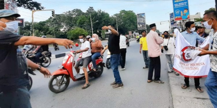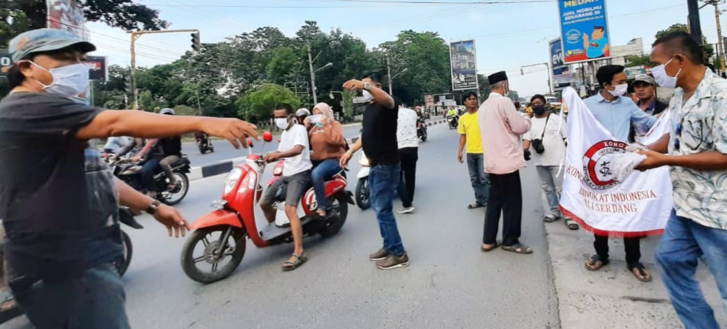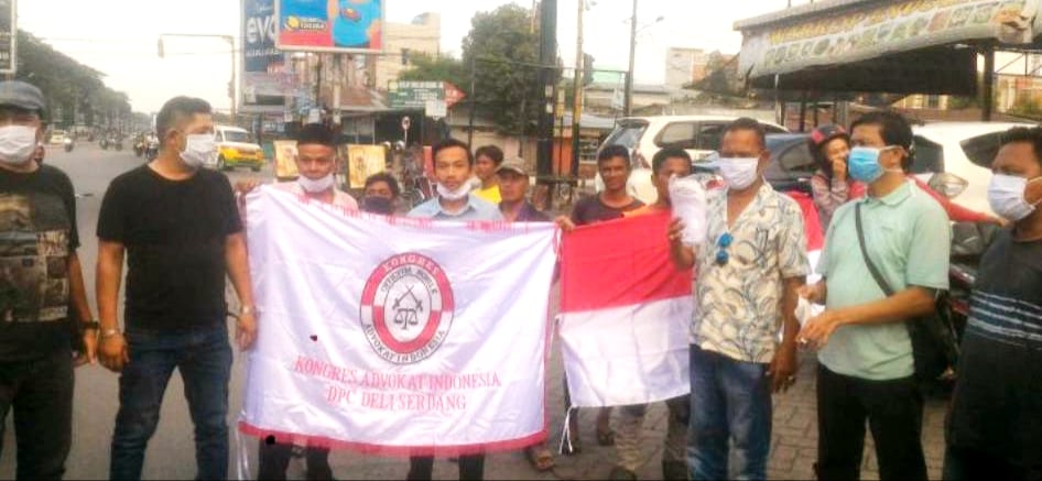 TASLABNEWS, DELI SERDANG –Mengantisipasi penularan Covid-19, Pengurus DPC Kongres Advokasi Indonesia (KAI) Deli Serdang, bersama Kelompok Kerja Wartawan Percut Sei Tuan (PWP) membagikan masker kepada masyarakat yang pengendara sepada motor di kawasan Simpang Unimed Medan Estate, Rabu (25/3/2020).