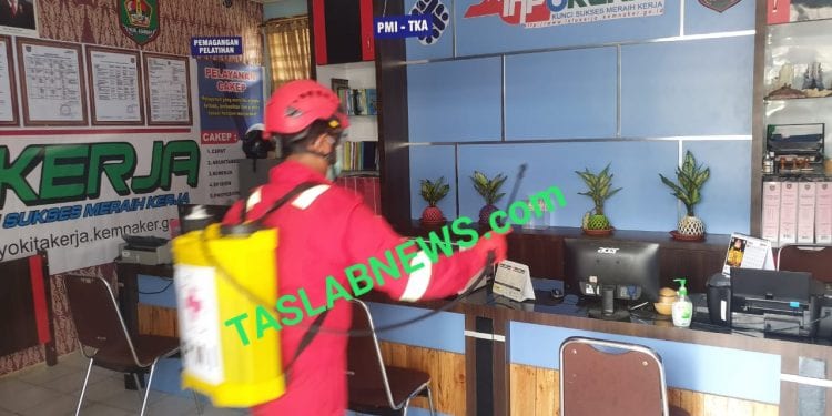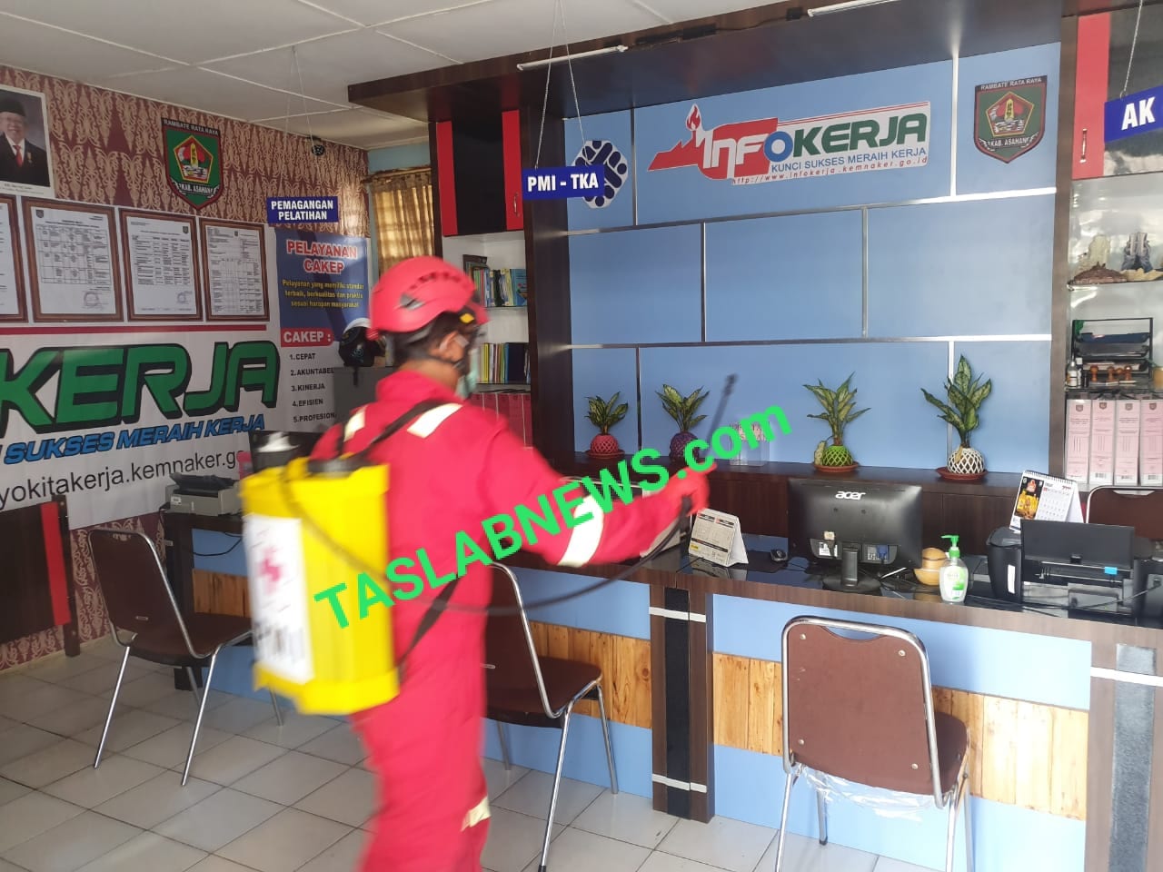 TASLABNEWS, ASAHAN– Dinas Ketenaga Kerjaan (Disnaker) Kabupaten Asahan dan Palang Merah Indonesia (PMI) melakukan penyemprotan desinfektan di kantor Disnaker Asahan.