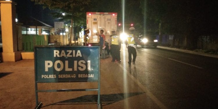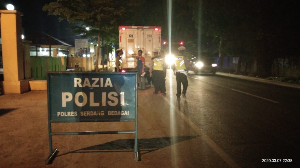 TASLABNEWS, SERGAI- Personel Polres Sergai melaksanakan giat razia Stasioner, Patroli Blue Light dan antisipasi aksi kejahatan di jalinsum guna dalam kelancaran arus lalu lintas di Jalan Umum Kota Perbaungan, tepatnya di Depan Mapolsek Perbaungan, Sabtu (7/3/2020) sekira pukul 22:00 WIB.