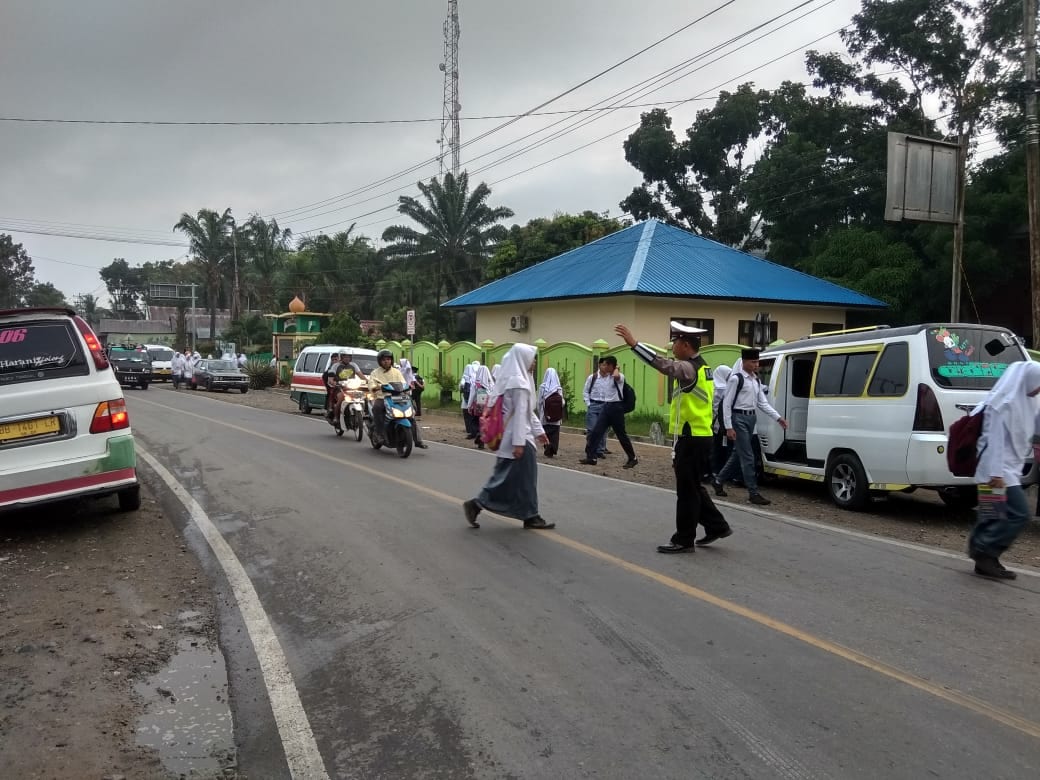 Seluruh personil satuan lalu lintas Polres Madina ini sibuk melakukan pengaturan arus lalu lintas dan membantu para pelajar untuk menyerang jalan yang padat dilalui oleh kenderaan.