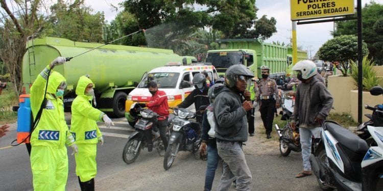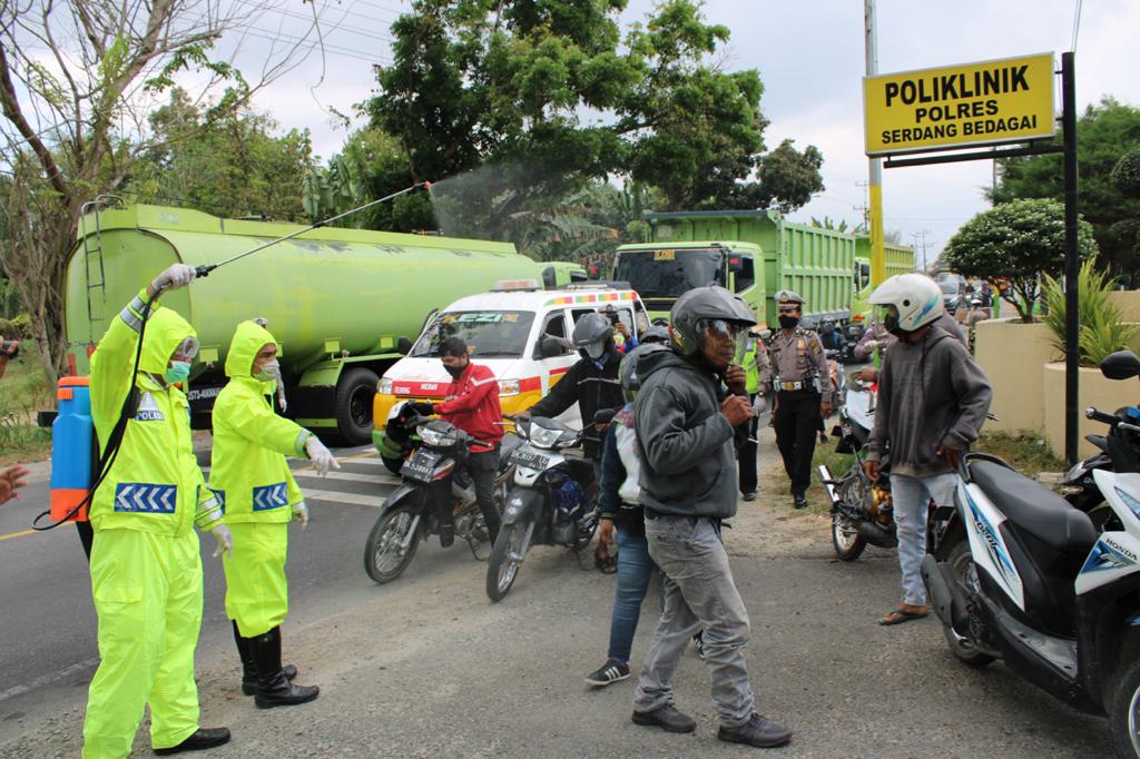 Melakukan penyemprotan cairan desinfektan secara massal terhadap pengguna jalan dan penumpang kendaraan umum serta kendaraan pribadi sebagai upaya dalam melakukan pencegahan terhadap penyebaran virus corona,”Tegas Kasat Lantas Polres Sergai, AKP Agung Basuni.
