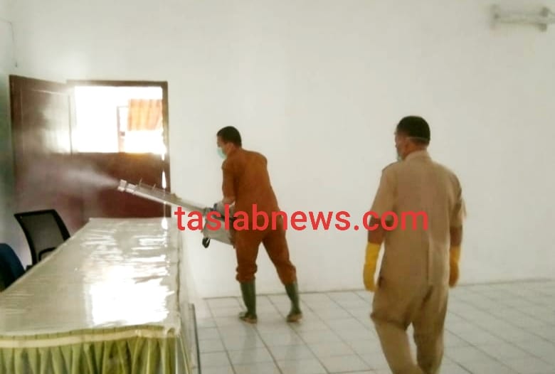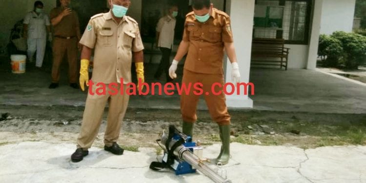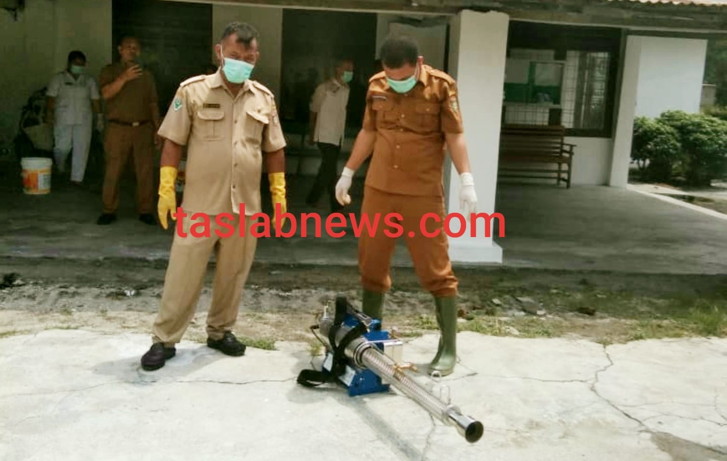 TASLABNEWS, ASAHAN – Puskesmas Pulo Rakyat Dinas Kesehatan Kabupaten Asahan melakukan penyemprotan desinfektan di Kantor Camat Pulo Rakyat Kabupaten Asahan untuk mengantisipasi penyebaran virus Corona (Covid-19), Selasa (24/3/2020).