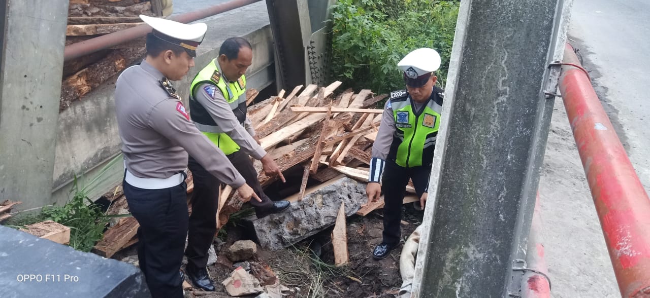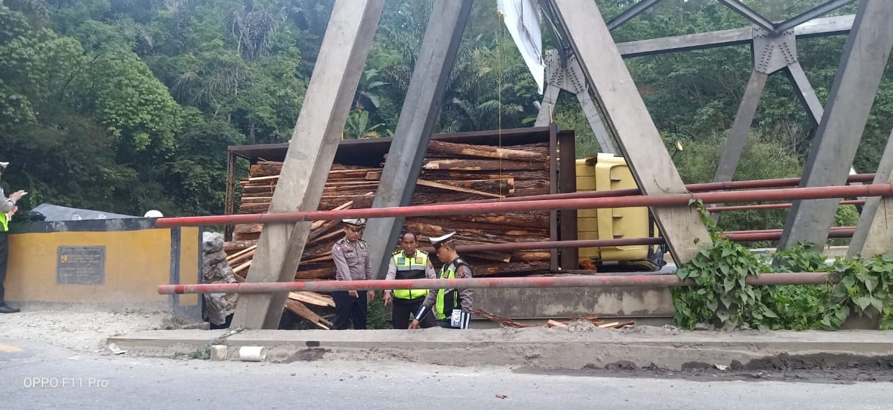 TASLABNEWS, SIMALUNGUN – Satu unit truk Colt Diesel bermuatan kayu alvit pinus terbalik saat melintas di Jalinsum Parapat-Balige tepatnya di atas jembatan Sisera-Sera, Kecamatan Girsang Sipangan Bolon, Kabupaten Simalungun, Kamis (5/3/2020) sekira pukul 14.30 Wib, menimpa 3 pegawai PDAM Tirtalihou Unit Parapat, seorang tewas di tempat kejadian, 2 mengalami luka-luka berat.