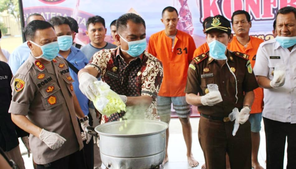 TASLABNEWS, SERGAI – Polres Serdang Bedagai (Seegai) menggelar konferensi pers pemusnahan barang bukti narkotika jenis Sabu, Pil Ekstasi dan daun ganja kering, dengan jumlah total senilai Rp1,5 Miliar, dengan cara di rebus dan dibakar, Kamis (19/3/2020) sekira pukul 14:00WIB di Depan Mako Polres Sergai di Seirampah.