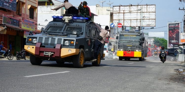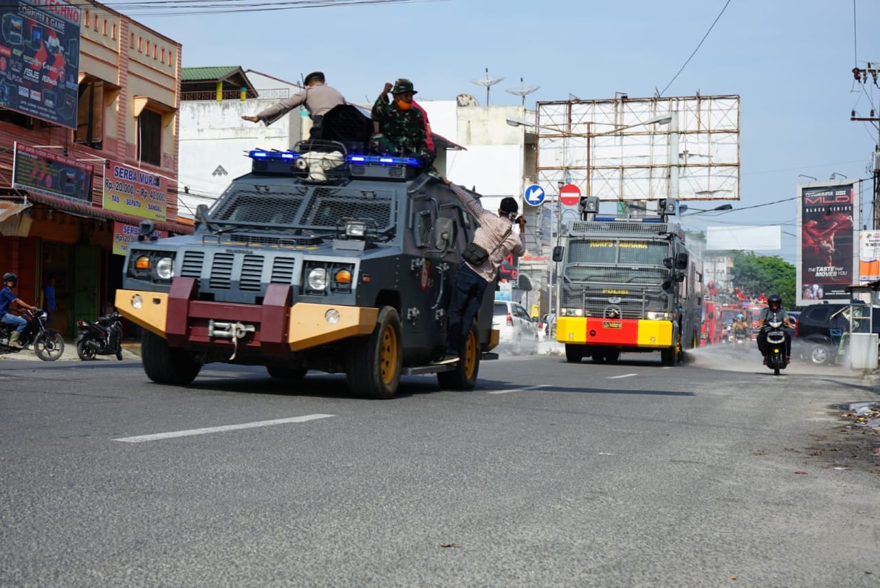 Pasca pelaksanaan apel gabungan, Bupati Asahan, Ketua DPRD Kabupaten Asahan, Kapolres Asahan dan Dandim 0208 Asahan yang tergabung dalam Tim Gugus Tugas Covid-19 Kab. Asahan melepas keberangkatan mobil Water Canon Polres Asahan dan mobil Pemadam Kebakaran Satpol PP Kabupaten Asahan untuk melaksanakan tugas penyemprotan desinfektan di seputaran Kota Kisaran. (Syaf)