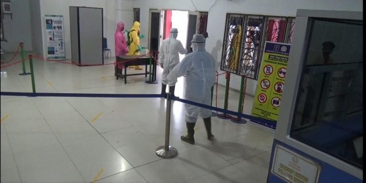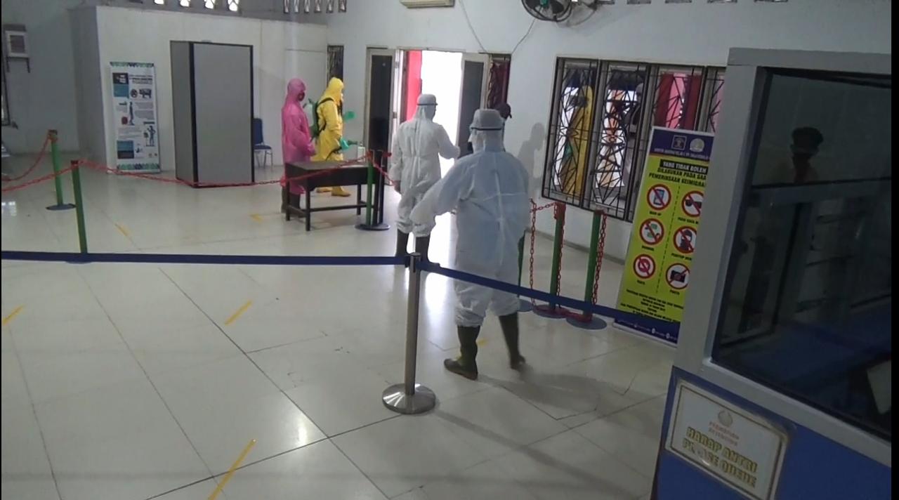 Begitu feri tiba di Pelabuhan Teluk Nibung, tim kesehatan dengan menggunakan APD melakukan penyemprotan disinfektan ke dalam kapal, termasuk orang dan barang bawaan.