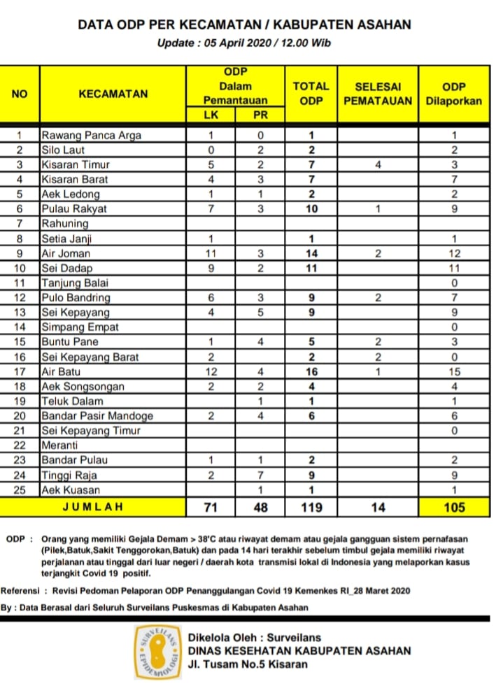 TASLABNEWS, ASAHAN– Sebanyak 105 warga Kabupaten Asahan masuk dalam orang dalam pemantauan (ODP). Sementara 14 orang sudah selesai dalam pemantauan.