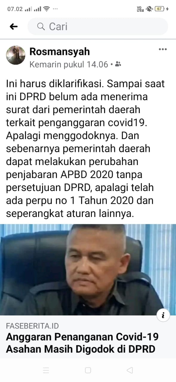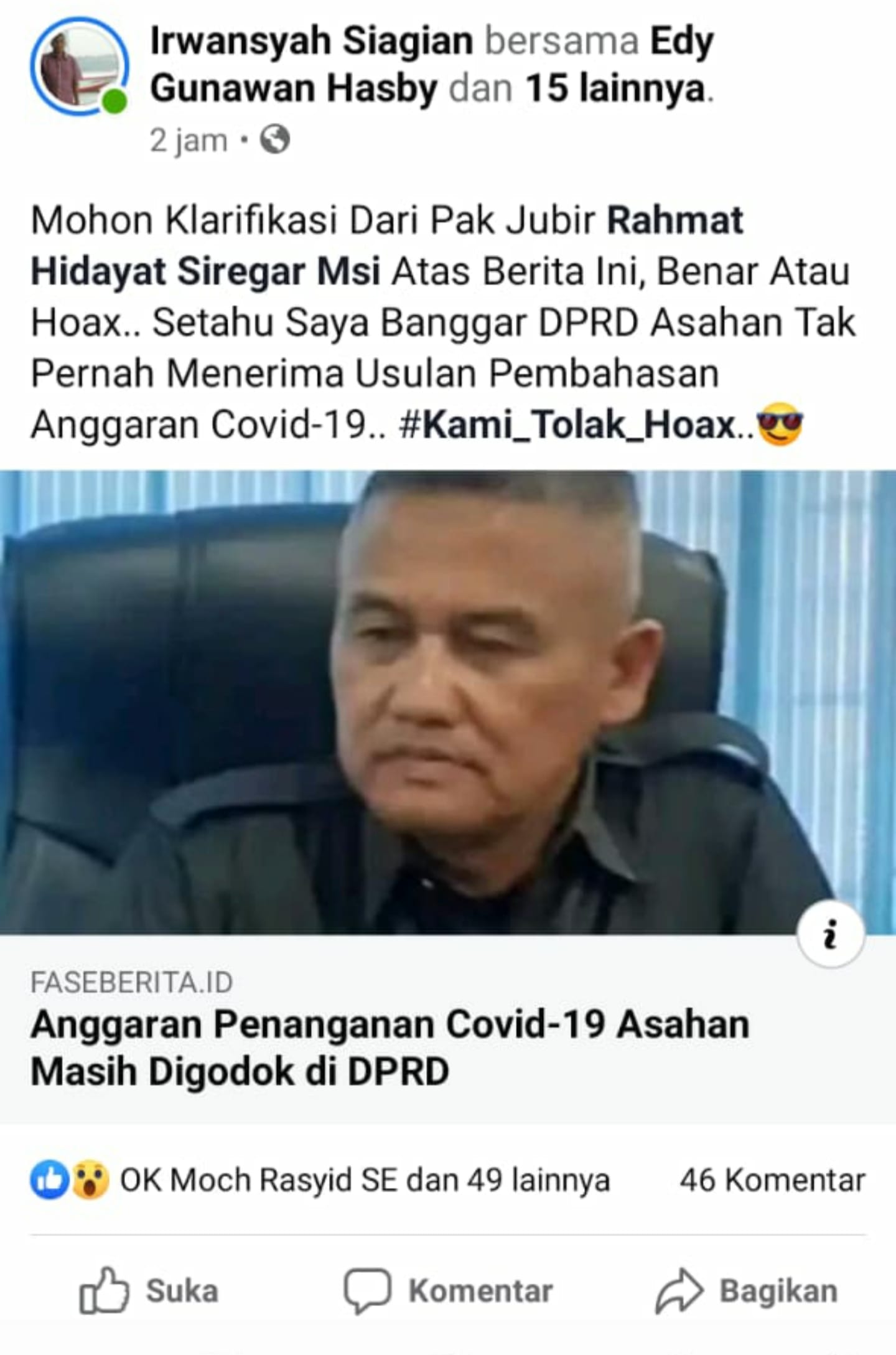Sebelumnya, dalam berita yang berjudul Anggaran Penanganan Covid-19 Asahan Masih Digodok di DPRD yang diterbitkan satu media online dituliskan bahwa Rahmat Hidayat sebagai jubir Gugus Depan Covid-19 mengatakan bahwa anggaran penanganan Covid-19 masih digodok di DPRD Asahan.