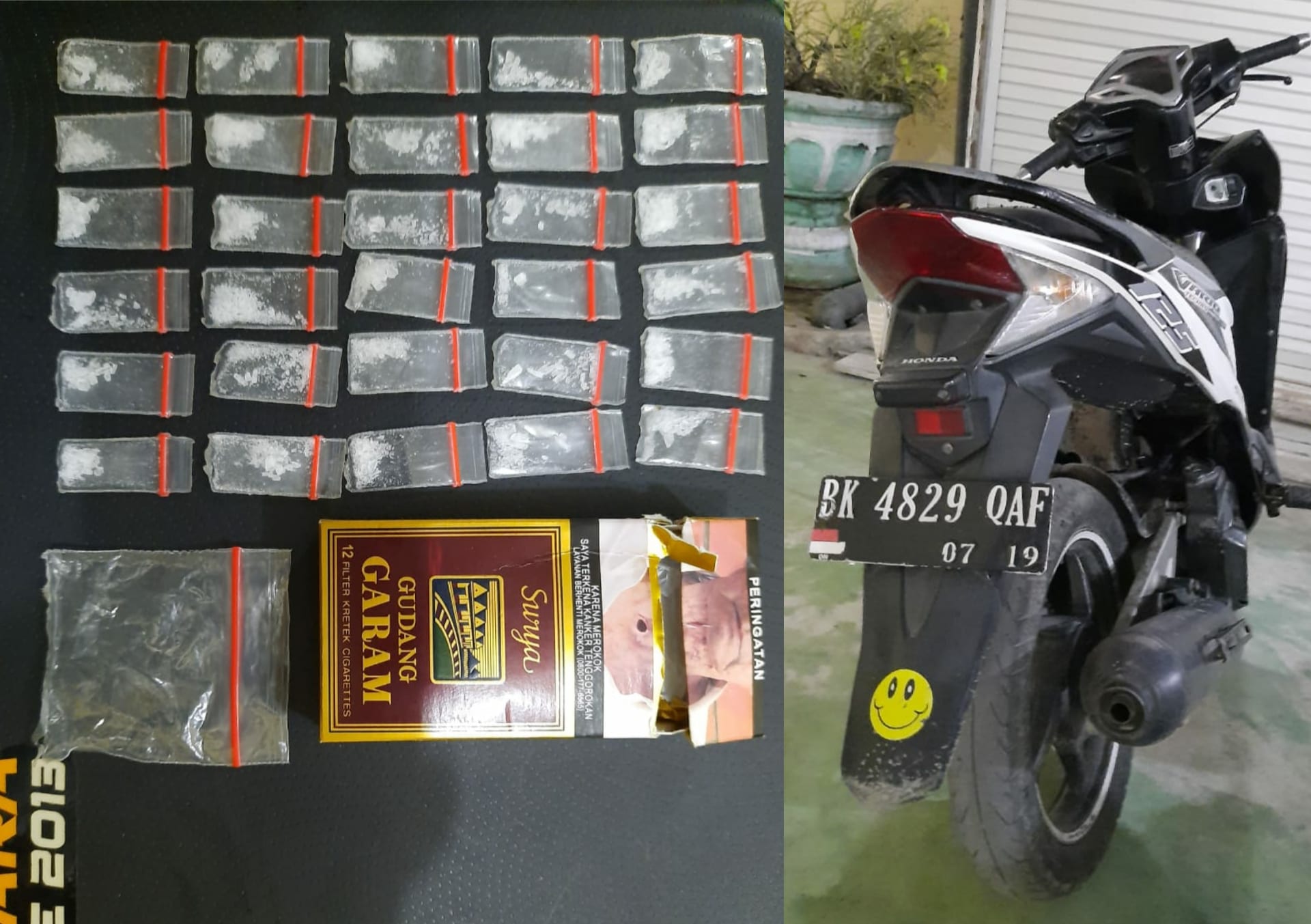 “Ketika diperiksa, ternyata kotak rokok tersebut berisi satu bungkus plastik klip sedang transparan yang didalamnya berisi 30 bungkus plastik klip transparan diduga berisi narkotika jenis sabu dengan berat kotor 3,95 Gram,” ujar Kapolres Tanjungbalai.