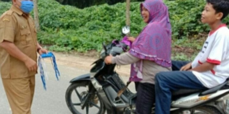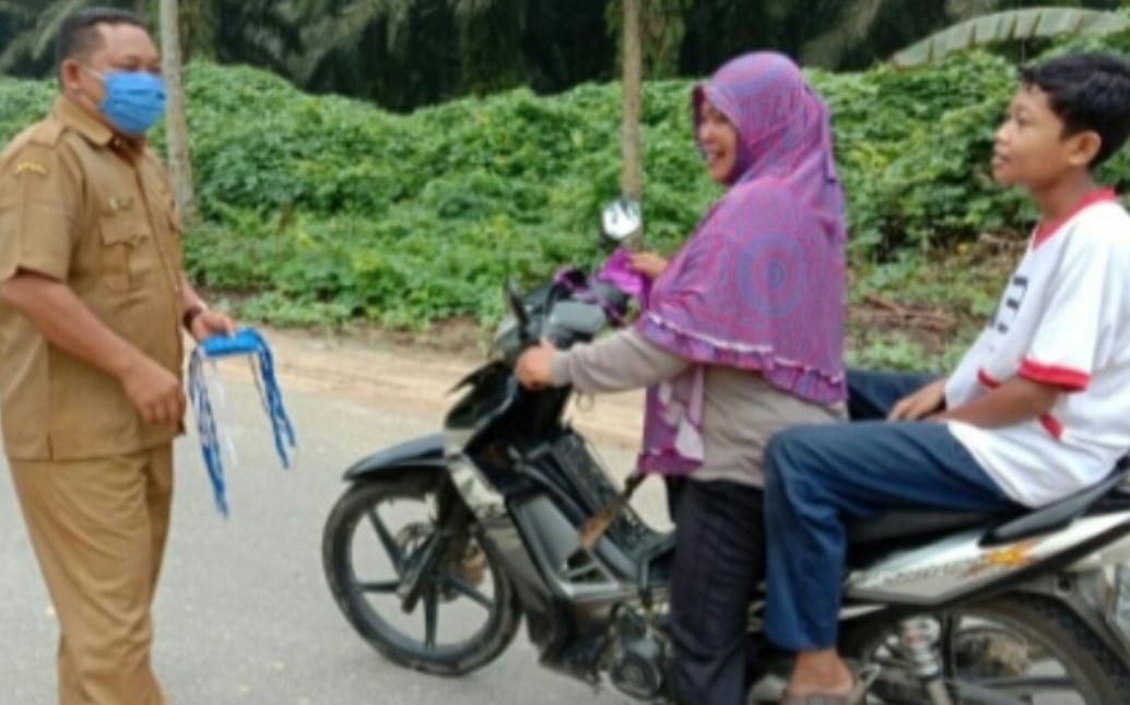 Foto : Kades Kampung Padang memberikan masker kepada warga.