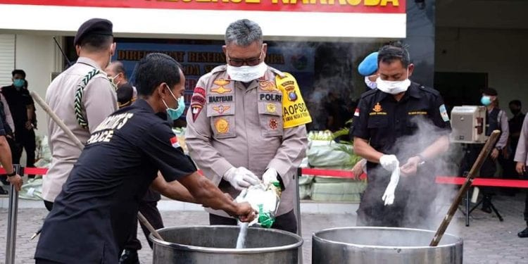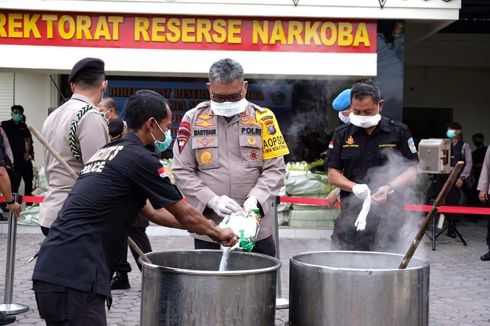 Dari keseluruhan pasal dan ancaman yg di persangkakan kepada para tersangka yaitu pasal 114,112 ayat (2) pasal 132 ayat (1) UU RI no 35 tahun 2009 dengan ancaman hukuman pidana mati, pidana penjara seumur hidup atau pidana penjara paling cepat 6 tahun. Kemudian Kapolda Sumut bersama wakapolda Sumut dan para PJU serta perwakilan kejaksaan bersama – sama memusnahkan barang bukti dengan cara membakar dan merendam barang bukti. (Ril/Syaf)