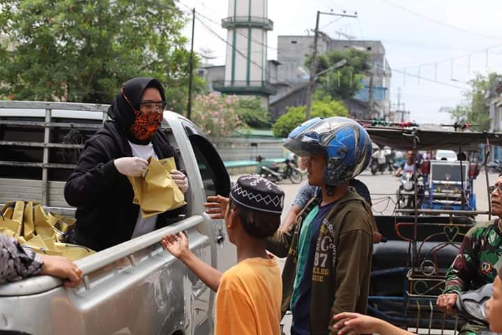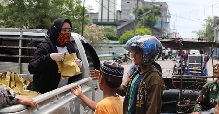 Pantauan wartawan, Vita memberikan bungkusan makan siang kepada warga dan tukang becak yang baru menyelesaikan sholat jumat di sekitaran Jalan Masjid dan pusat Kota Tanjungbalai Jumat (10/04/2020) .