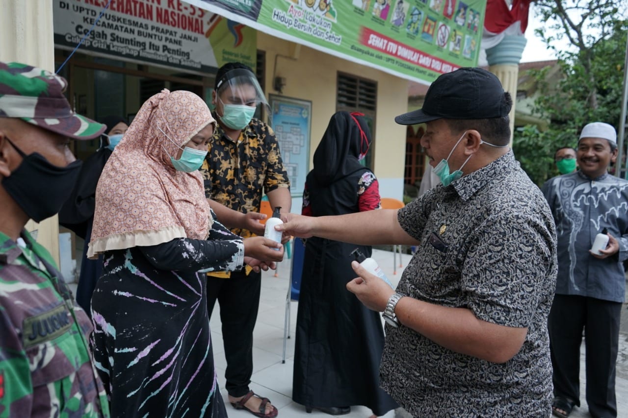 Sedang di Puskesmas Tinggi Raja sekda menyerahkan 50 pcs masker, Sarung Tangan 50 pcs, Baju APD 7 pcs, Hand Sanitezer 8 botol dan Susu Bear Brand 30 kaleng.