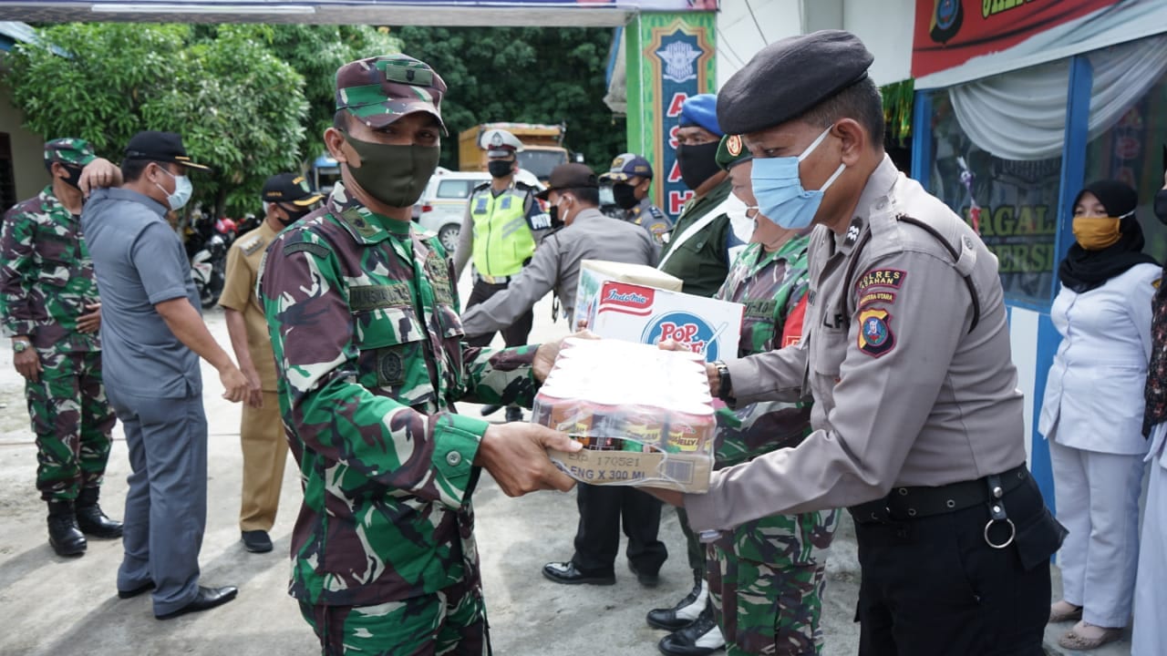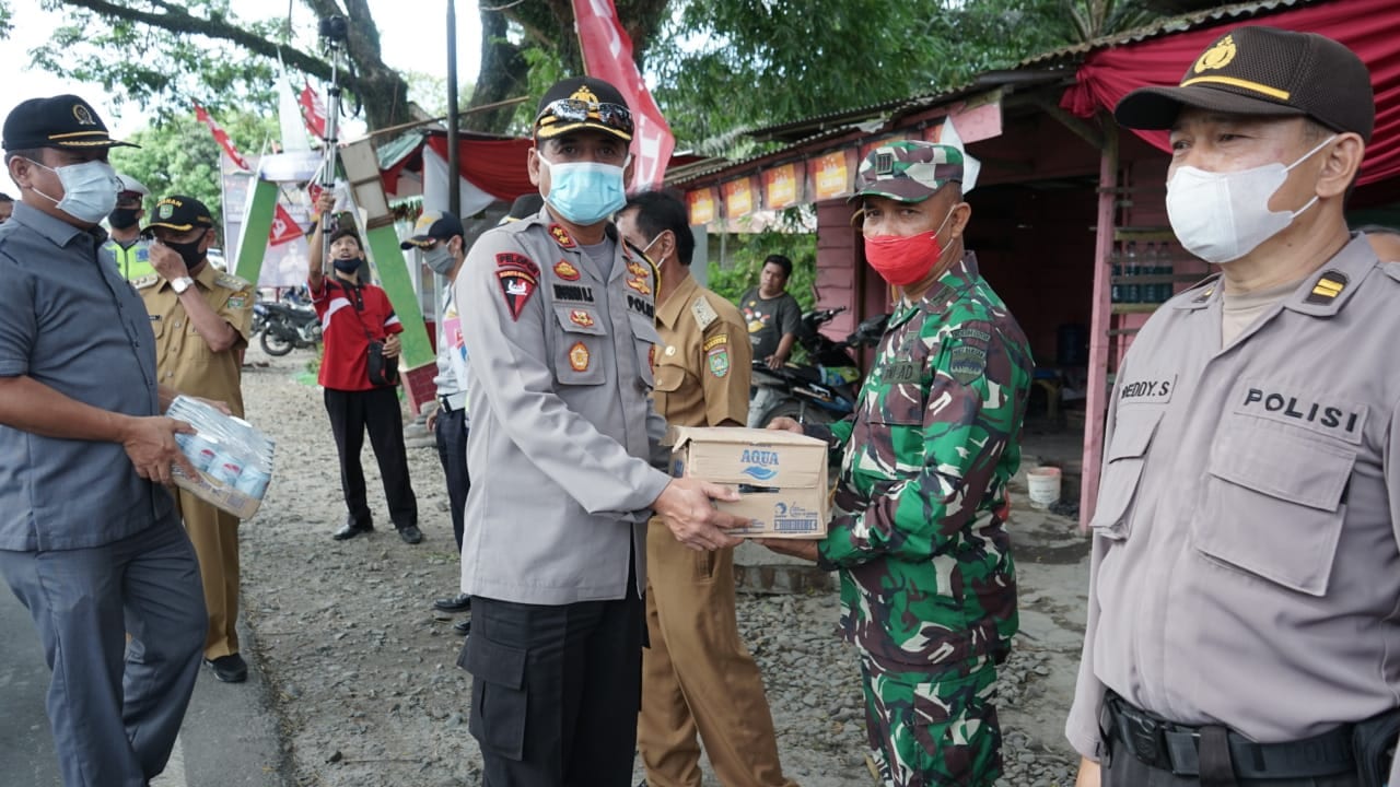 Selanjutnya, Bupati beserta rombongan memberikan bingkisan berupa makanan dan minuman untuk personel Pospam dalam melaksanakan tugas pengamanan Operasi Ketupat Toba 2020.