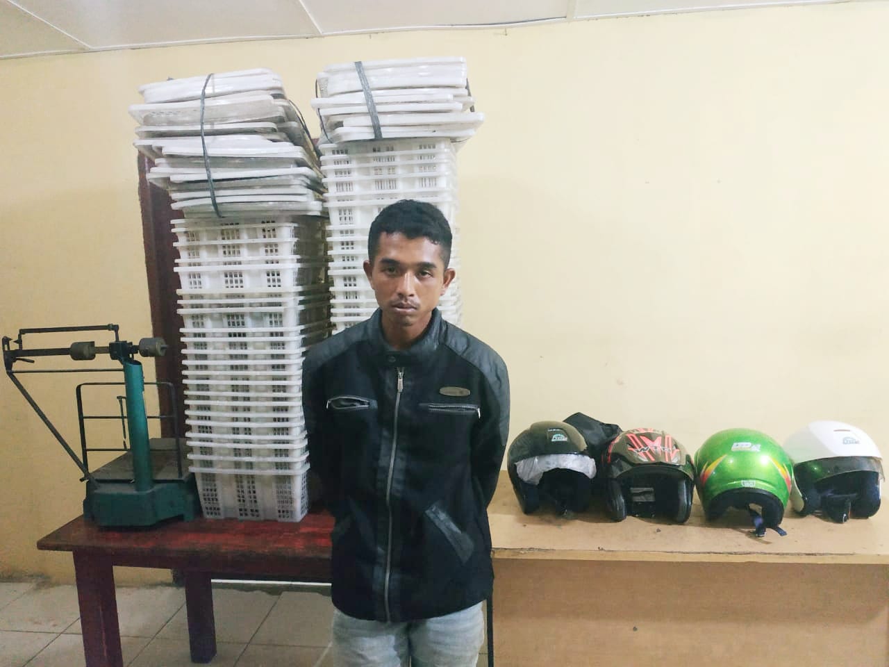 Petugas mengamankan barang bukti, berupa 52 keranjang plastik warna putih,1 helm merk LTD warna putih,1 helm merk LTD warna Hijau,1 helm merk LTD warna hitam,1 helm merk WTD warna hitam lis merah dan 1 Timbang duduk warna biru.